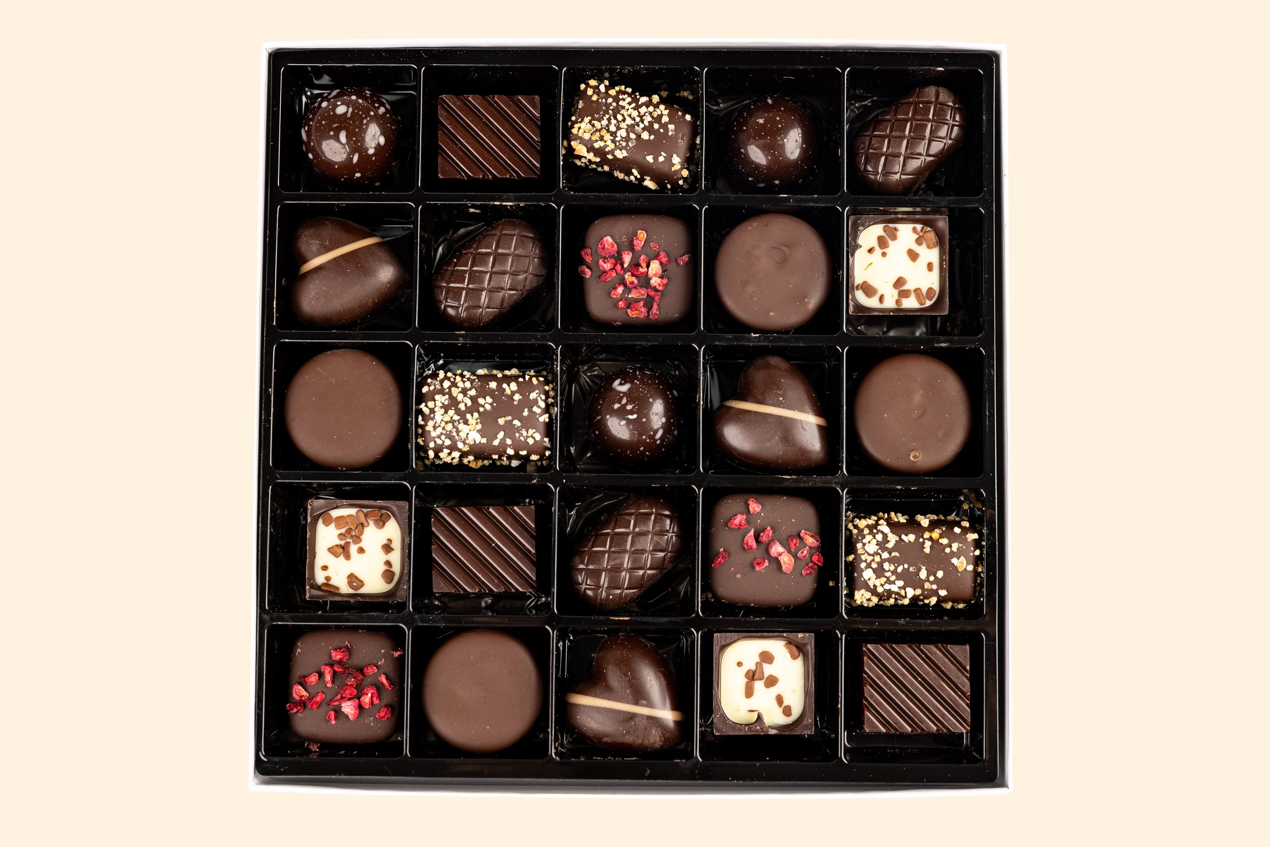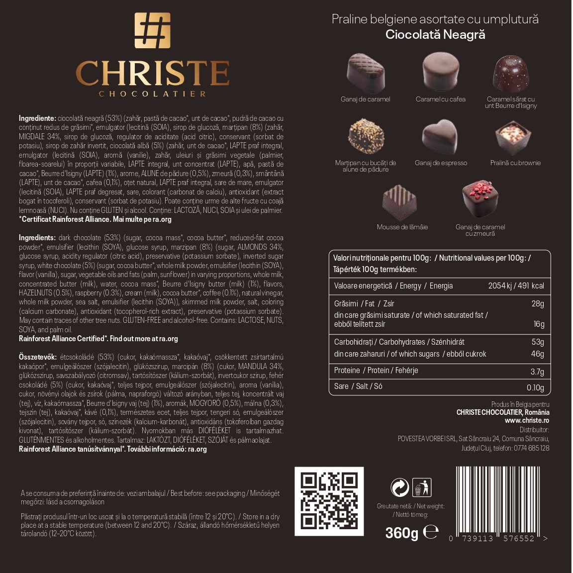 O cutie deosebită, cu praline praline artizanale din ciocolată belgiană realizate exclusiv din ciocolată neagră. Gust intens, texturi fine și arome atent echilibrate. Include: Ganaj de caramel, Caramel cu cafea, Caramel sărat cu unt Beurre d’Isigny, Marțipan cu bucăți de alune de pădure, Ganaj de espresso, Pralină cu brownie, Mousse de lămâie, Ganaj de caramel cu zmeură – o experiență profundă, gândită pentru iubitorii de ciocolată neagră autentică.