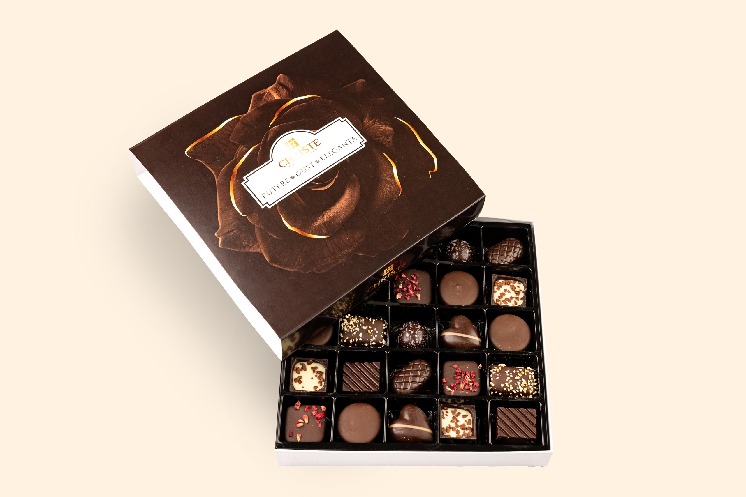 Pralinele din această cutie se armonizează perfect cu: Vin roșu sec, corpolent și fructat, cu taninuri fine sau Vin alb sec, mineral și vibrant, pentru un contrast proaspăt.